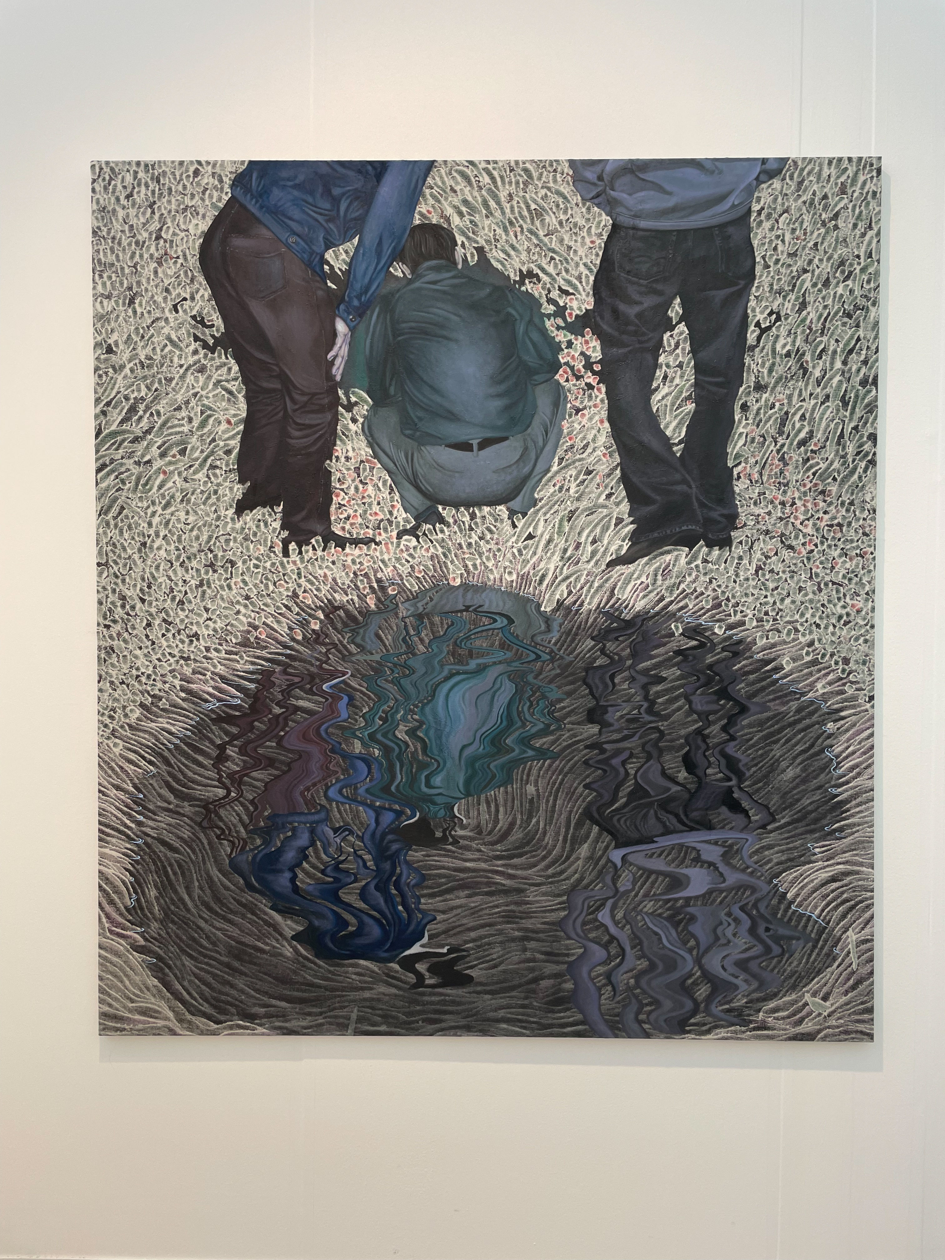 Featured as part of a solo presentation, Und alles rund vergisst is a striking near monochromatic oil and acrylic on canvas painting that depicts three figures with their backs facing the viewer. Part of Michael Ho’s project, Tryst, at Gallery Vacancy’s booth, the work forms part of a larger narrative that examines Yellow Peril, the thought there is a political threat being posed by the people of southeast Asia as an existential danger to Western existence. Ho’s paintings all feature Dr. Fu Manchu, a supervillain cartoon character. Although the character is always present, he is only ever partially revealed alluding to the mystified perception of racial thought in contemporary history.