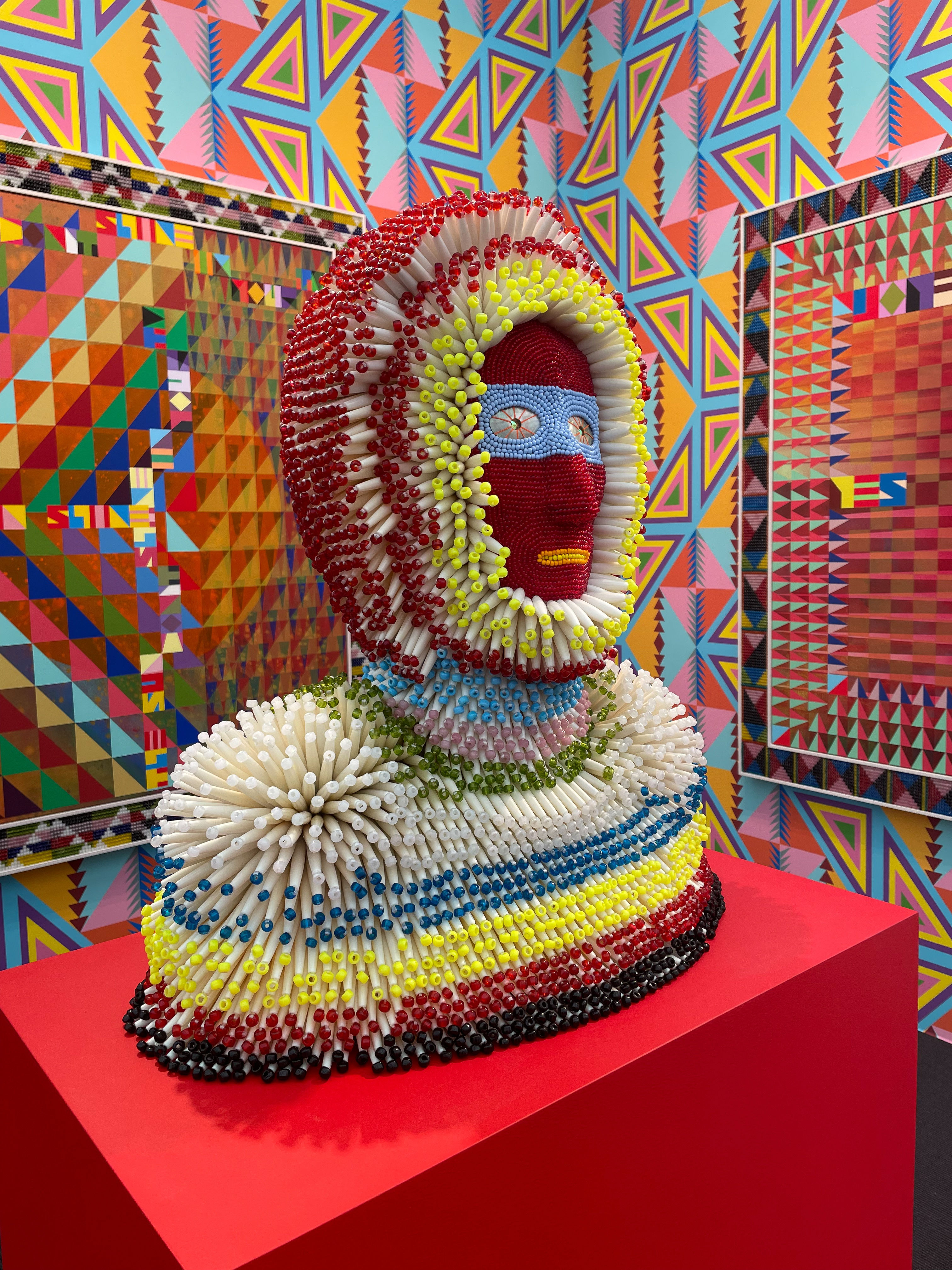 Created from abalone, crystals and glass beads, Jefferey Gibson’s sculpture Stars In Their Eyes is as hypnotic as it is colourful. Situated in the Stephen Friedman booth amongst bright patterned wallpaper and other mixed-media works by Gibson, the solo presentation marked the artist’s first show with the gallery. In his practice, Gibson fuses traditional techniques from Choctaw-Cherokee artisanal handcraft with references from fashion, queer theory and club culture to create vibrant works that celebrate historically marginalised identities.