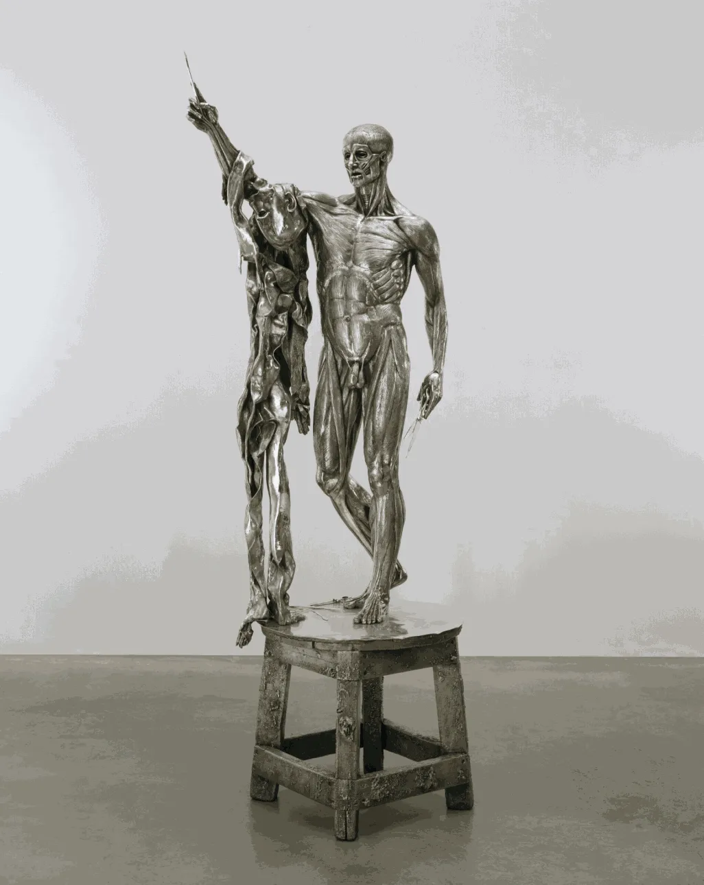 Hirst’s silver sculpture looks to the story of Bartholomew the Apostle, who was famously skinned alive for his Christian beliefs. He is often portrayed with his skin and a knife, perhaps most famously in Michelangelo’s The Last Judgement and in the sculpture St Bartholomew Flayed in the Duomo di Milano. Hirst continues this tradition with his own interpretation, in which the martyr holds scissors rather than a knife, in an allusion to Edward Scissorhands.